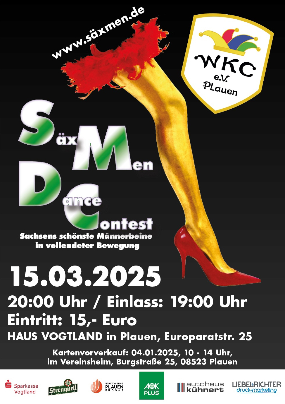 Einmal im Jahr ist es soweit: Die schärfsten Männerbeine aus dem Vogtland und ganz Sachsen treffen sich in Plauen zum Wettkampf. Dann präsentieren die Männerballetts und Tanzgruppen der sächsischen Karnevals- & Faschingsvereine ihr aktuelles Programm. Wer den Wanderpokal mit nach Hause nehmen darf, bestimmt eine Jury-Auswahl, aber eigentlich gibt es nur Gewinner, denn im Vordergrund des SÄXMEN DANCE CONTESTS steht der Spaß und das Zusammentreffen verrückter und begeisterter Karnevalisten und natürlich deren Fans und Unterstützer.